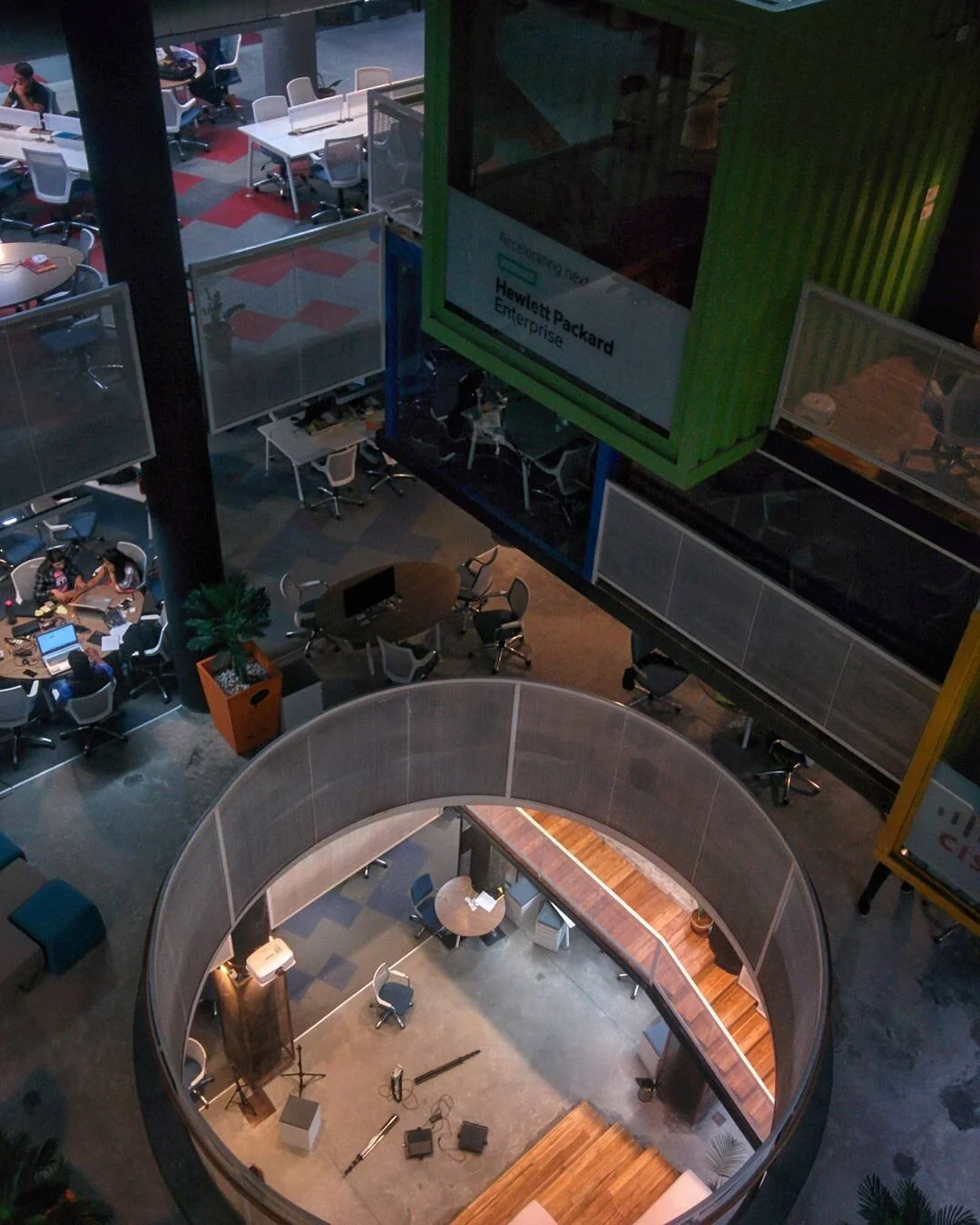 #colourful #intresting_spaces #container_cabins #voids #cutouts #meshrailings #rawness #eclectic #architecture
