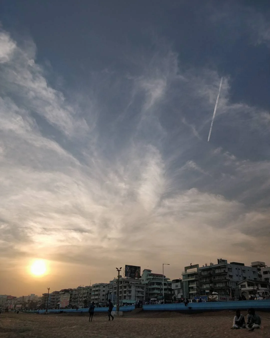 View fullsize .. like the perfect #duskshot , with the warm winter sun setting in the cirrus skies, the jet trail and the beachroad's skyline.